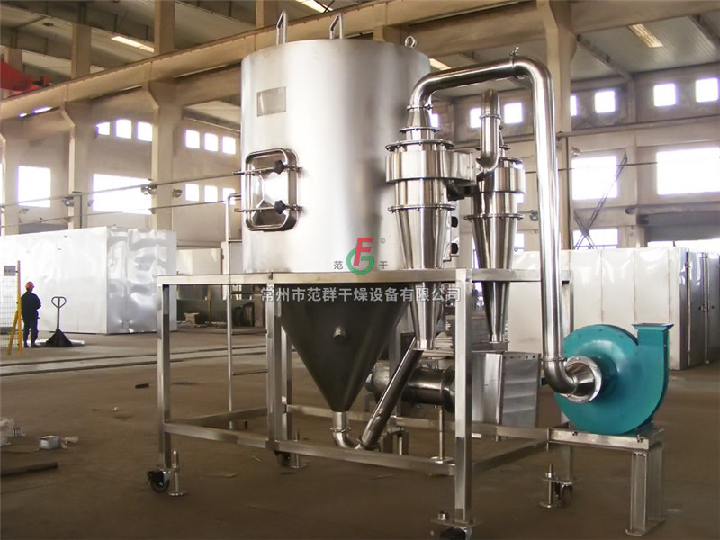 空氣通過加熱器轉化為熱空氣,進入裝置在干燥室頂部的熱風分配器,然后均勻的進入干燥室,同時通過無級調速的螺桿泵將料液送至裝置在干燥室頂部的離心霧化器,使料液霧化成極小的霧化液滴,料液和熱空氣并流接觸,水份迅速蒸發在極短的時間內干燥為成品,成品經干燥塔底部和旋風分離器排出,廢氣由風機抽出排空。