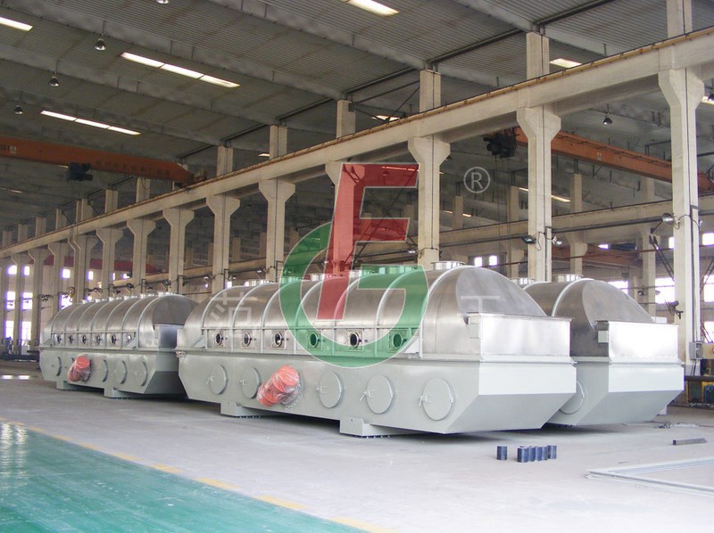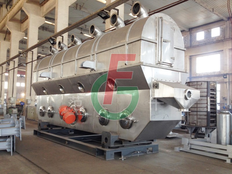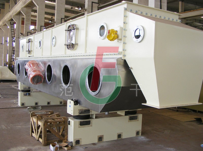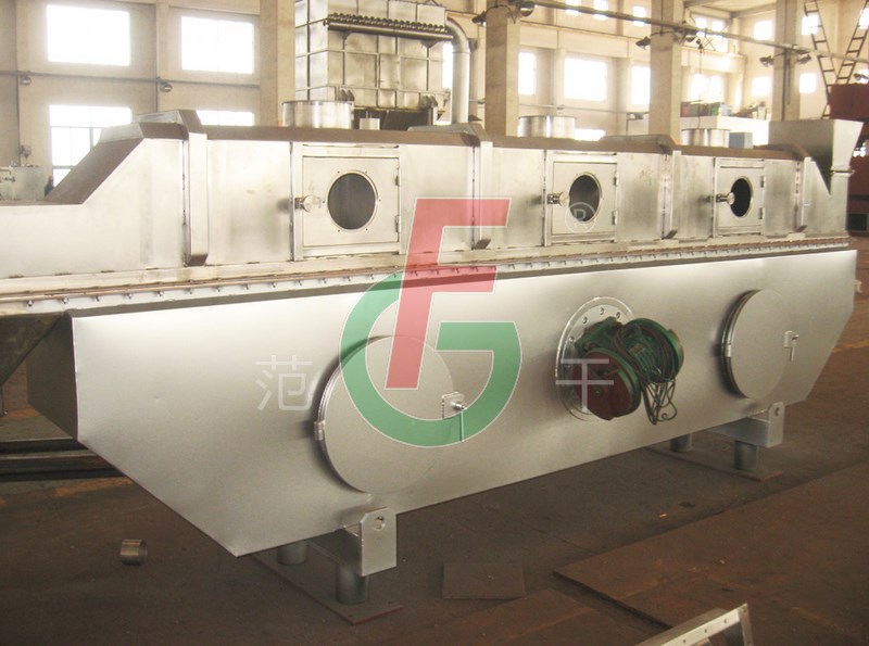 物料自進料口進入機內(nèi),在振動作用下,物料沿流化床水平方向拋擲向前連續(xù)運動,熱風向上穿過流化床同待處理物料進行熱質(zhì)后,濕空氣經(jīng)旋風分離器除塵后由排風口排出,干燥物料由排料口排出。