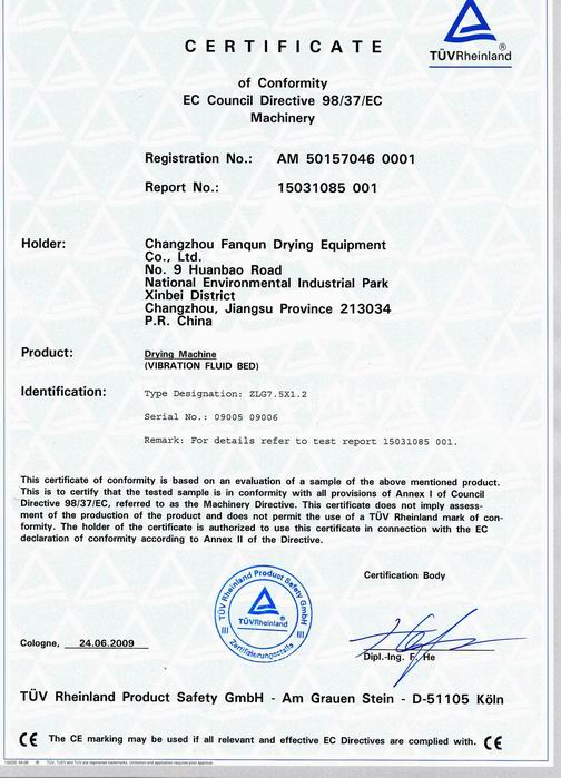 2009年6月底,經(jīng)公司領導和員工的全體努力,公司產(chǎn)品流化床順利通過CE認證,有力推動我公司產(chǎn)品出口歐洲,加快走向國際市場的步伐。