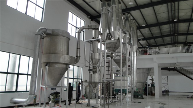 帶有粉碎機的氣流干燥裝置,是在氣流干燥管下面裝有一臺沖擊式錘磨機,用以粉碎濕物料,減小粒徑,增加物料表面積,強化干燥。因此大量的水分在粉碎過程中得到蒸發,在一般情況下,可完成氣化水分量的80%。這樣,便于采用較高的進氣濕度,以獲得大的生產能力和高的傳熱效率。